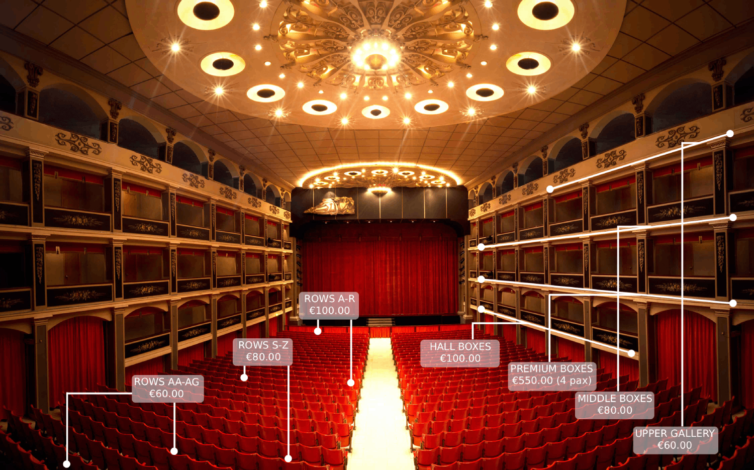 This largest opera house on the islands hosts its esteemed audiences in the stalls, a level of Âhall boxes accessed from within the auditorium, two other boxed tiers and an upper gallery. Its u-shape design, slope, architectural features, and deliberate choice of furnishing fabrics and materials including the soffit, endow the Teatru tal-Opra Aurora with perfect acoustics making it an ideal venue for operas and any other musical form of entertainment.
